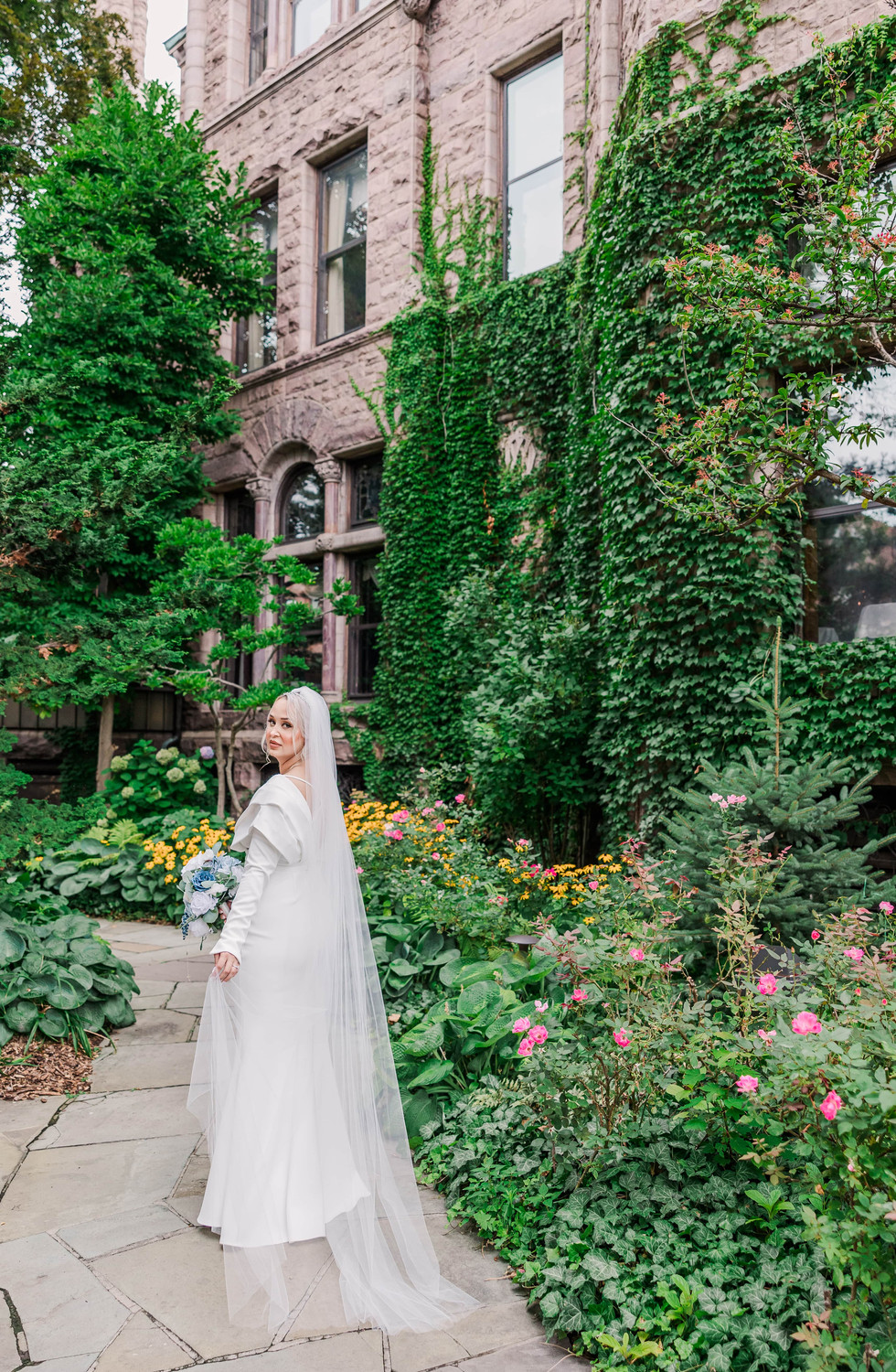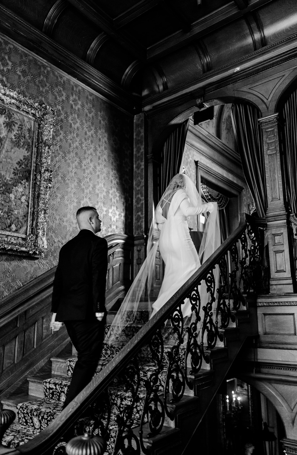 On the day of their elopement, Domenika arrived in a sleek yet timeless satin gown, her hair styled in a soft updo and a dramatic cathedral veil. Eger waited for her at the sculpture, in the front of the mansion and as they shared their first look, the architecture and lush gardens created cinematic and timeless moment.